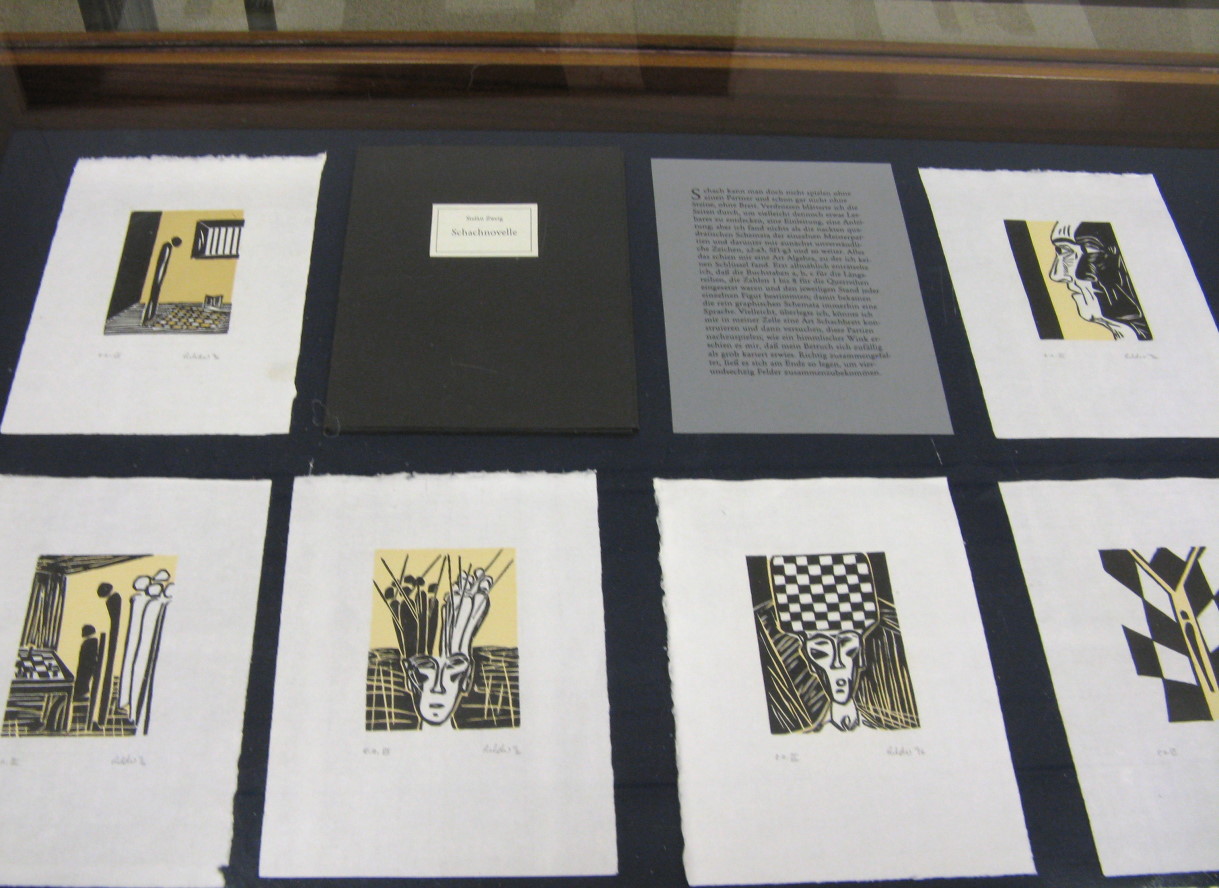 wurden. Ausgestellt und im Katalog abgebildet ist auch die Mappe mit 6 Farbholzschnitten von Elke Rehder zur Schachnovelle von Stefan Zweig. Die Mappe erschien 1996 in der
