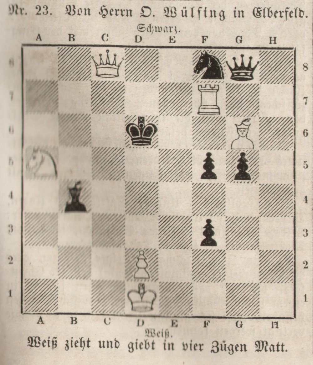 Nr. 23 - Otto Wülfing (11.10.1824–25.09.1864) war ein starker Schachspieler aus Elberfeld. 1862 belegte er im Schachturnier am 7. und 8. September 1862 in Düsseldorf den zweiten Platz nach Max Lange. Die Elberfelder Schachgesellschaft (gegründet 1851) trug zusammen mit dem Düsseldorfer Schachverein von 1854 und dem Krefelder Schachklub maßgeblich zur Gründung des Westdeutschen Schachbundes bei, welcher die Rheinischen Schachkongresse ausrichtete.