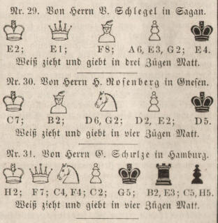 Nr. 29 - Victor Schlegel (auch Viktor). Der Name dieses Schachkomponisten erscheint in der Berliner Schachzeitung 1860 Seite 359 "Selbstmatt durch Zugzwang" als "V. Schlegel (Sagan)" u. a. in Verbindung mit weiteren Einsendern von Schachaufgaben wie z. B. G. Schlenther, Adalbert Moser (Königsberg) und Johannes Kohtz (Köln). Auch im Handbuch der Schachaufgaben wird "Victor Schlegel" 1862 von Max Lange mit der Ortsangabe Sagan genannt. Die ehemals schlesische Kleinstadt Sagan (heute Zagan in Polen) liegt ca. 100 Kilometer von Frankfurt a. d. Oder entfernt. Viktor Schlegel war 1852 am Gymnasium in Sagan. Es könnte sich um den Mathematiker Viktor Schlegel handeln. Stanislaus Ferdinand Viktor Schlegel wurde am 04.03.1843 in Frankfurt a. d. Oder geboren und starb am 22.11.1905 in Hagen in Westfalen. Seine Wirkungsorte waren: 1860-1863 Studium in Berlin, 1866 Lehrer in Breslau, Stettin, Anklam (1868), Waren Gymnasium (1869), Leipzig Universität (1881), Hagen Gewerbeschule (1886) und Königliche höhere Maschinenbauschule (1886). Prof. Dr. Schlegel verbesserte Verfahren in der Geometrie (Schlegeldiagramm). Es könnte also sein, dass Schlegel sich im Alter von 16 Jahren am Gymnasium in Sagan mit der Theorie des Schachspiels beschäftigt hat.