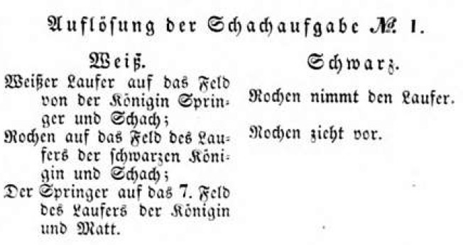 Wer Ihre Regel gelten lässt, wird auch Ihre Auflösung richtig finden müssen. Ihre Bemerkung, dass nach der Berichtigung in Nr. 22 nicht vier, sondern fünf Züge erforderlich sind, wenn Schwarz Königin von A5 nach E5 und Schach als zweiten Zug macht, ist ebenfalls unbestreitbar. Die von Ihnen eingesandte Schachaufgabe wird nächstens mitgeteilt werden. Ihre Bezeichnung der Felder durch Zahlen von 1 bis 64 erscheint minder bequem.