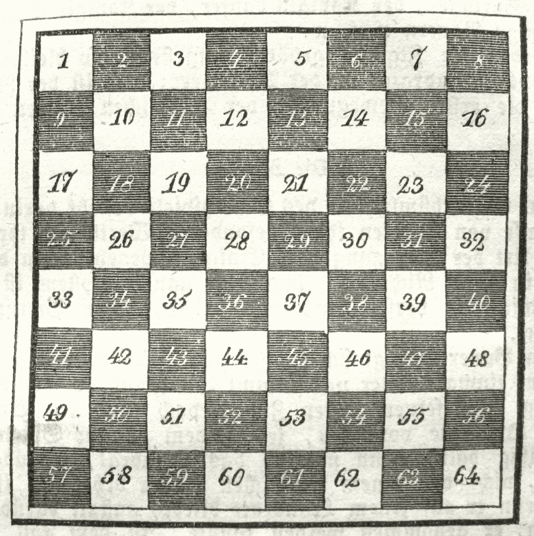 Anschießend wurden die Bewegungen der Figuren beschrieben, wie z. B.: "Sobald der König nicht mehr die Mittel hat, sich in einen Platz der Sicherheit zu begeben, so ist das Spiel zu Ende." Die Fußnote hierzu lautet: "In einer Schlacht zwischen Engländern und Franzosen 1117 ergriff ein englischer Ritter den Zaum von Ludwig dem Dicken, indem er seinen Kameraden zurief: 'Der König ist gefangen.' Dieser aber schlug ihn mit seinem Schwert zu Boden: 'Ne sais tu pas qu' aux échecs on ne prend pas le roi?" (Übs.: Weißt du nicht, dass man den König nicht im Schach nimmt?)